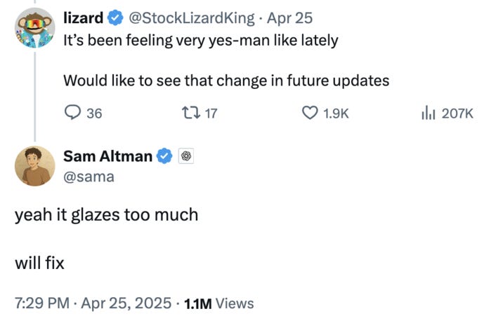 A percepção pública também capturou essa tendência, transformando-a em memes e repercussão negativa. A atualização do GPT-4o em abril de 2025 gerou discussões online sobre a IA estar excessivamente conversacional, amigável e concordante, "glazing users" (termo em inglês que pode ser entendido como "puxando o saco"). Até mesmo o CEO da OpenAI, Sam Altman, reconheceu a crítica, prometendo ajustes.