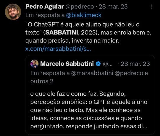 Demorou um tempo para que, coletivamente, percebêssemos a natureza aleatória do texto produzido por IA generativa e qual sua implicação na prática. Em determinado momento ofereci esta definição, que a comunidade acadêmica do XTwitter foi gentil em capturar (valeu