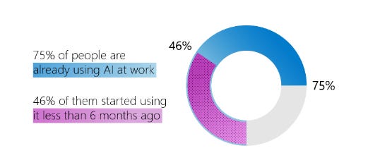 Pesquisa recente da Microsoft com 31.000 pessoas em 31 países mostrou que 75% dos trabalhadores do conhecimento usam IA, sendo que 78% usam por conta própria. Os "pesados" estimam ganhar 30 minutos por dia em produtividade com o auxílio destas ferramentas.